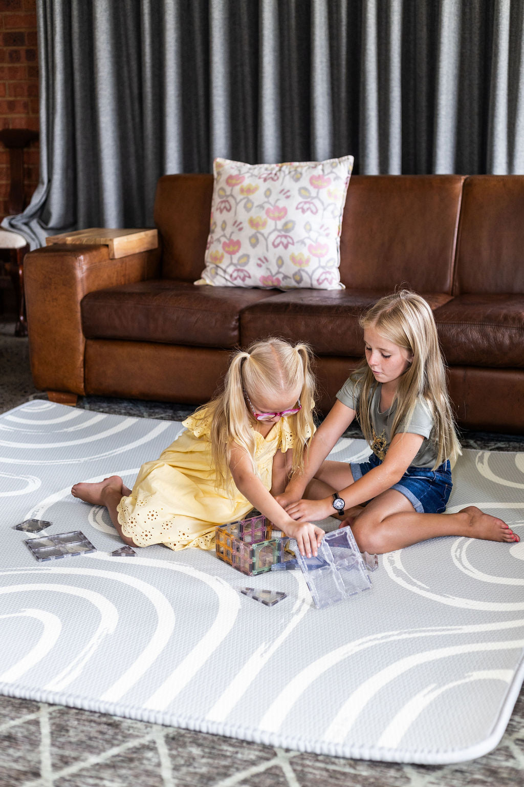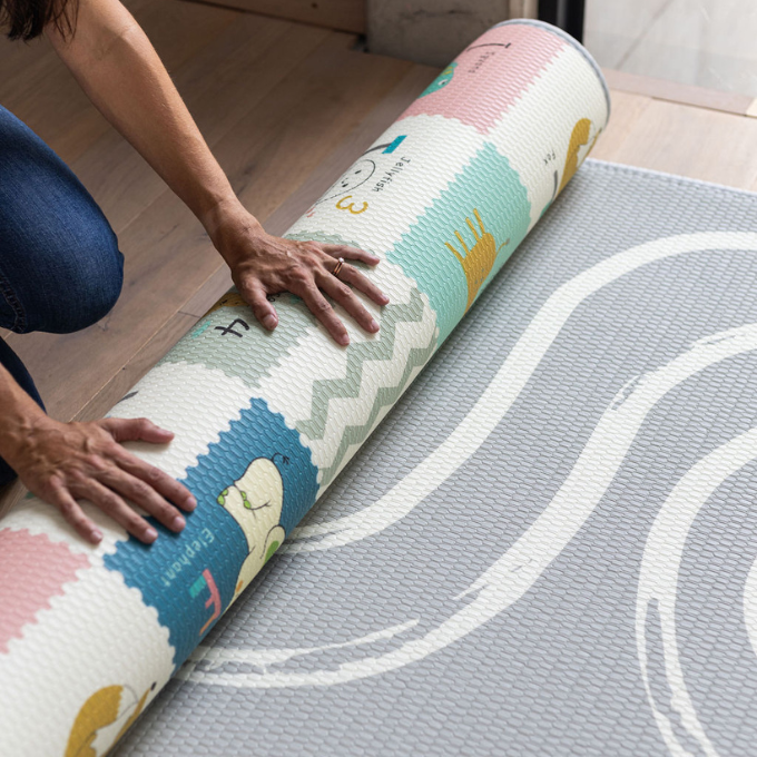 The neutral grey brush stroke design is one of our favourites. It will seamless blend into any room. Keep it face up when the adults are there and flip it over for play time.